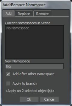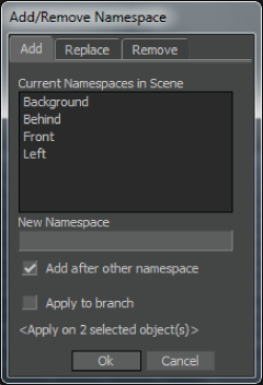 You can add, replace, and remove namespaces as you build a scene file. You can also append namespaces to other namespaces in the scene. See Namespaces within namespaces.