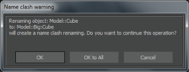 If you choose to proceed with the action, a number is prepended to the object’s name to give the object a unique name (for example “Big:Cube1”).