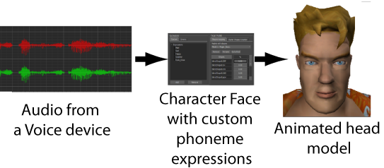 Using a Character Face and the Voice device, you can set up a character to “talk” with an audio file or live audio input as its voice. Through the Voice device, the phonemes in the audio input drive the expressions on the character’s face.