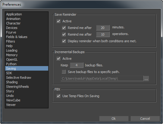 The FBX preference setting contains the Use Temp Files On Saving option, which lets you affect the behavior of the Save operation for FBX files. The following table describes the FBX preference setting.