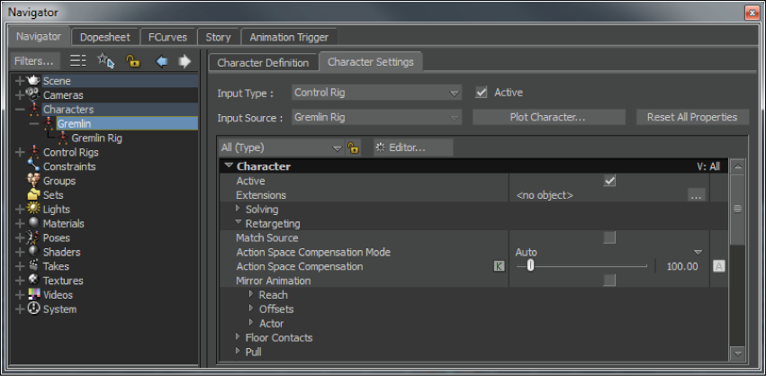 Keep in mind that the Character Settings let you work with the Character asset. The Character asset works as a template to help you define your model for MotionBuilder and connect it to a motion source. The Character Settings do not adjust the character model itself.
