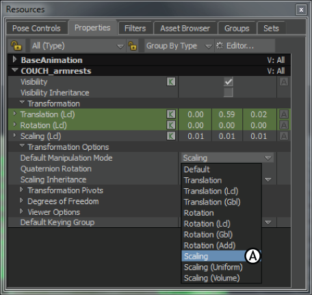 Properties window A. Setting a model’s Default Manipulation mode to Scaling.