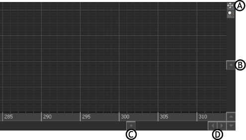 FCurves pane A. Pan and Zoom buttons B. Side scroll bar C. Bottom scroll bar D. Scroll arrows