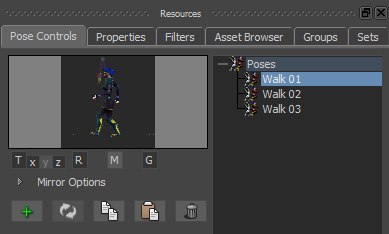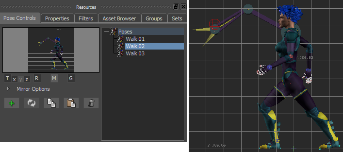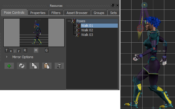 - In the Pose Controls Pose browser, double-click the Walk 02 pose.