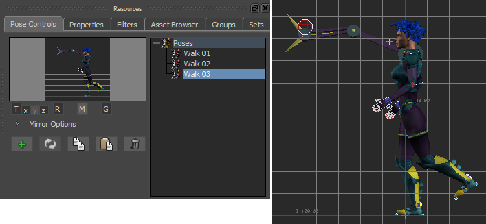 - In the Pose Controls Pose browser, double-click the Walk 03 pose.