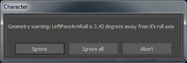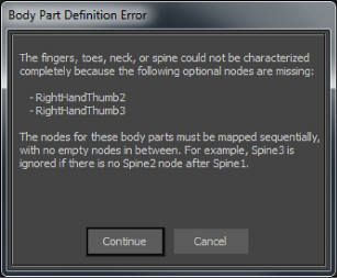 Because these slots are optional, you do not have to correct the problem to characterize your character. However, the affected body part may not react as expected when manipulated. Click Continue if you want to characterize your character anyway, or click Cancel to stop the operation and change the mapping.