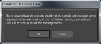 Depending on your model and the objects defined in the Mapping List, you may encounter errors when you attempt to characterize a character. You can ignore some of these errors, while other errors prevent your model from becoming characterized.