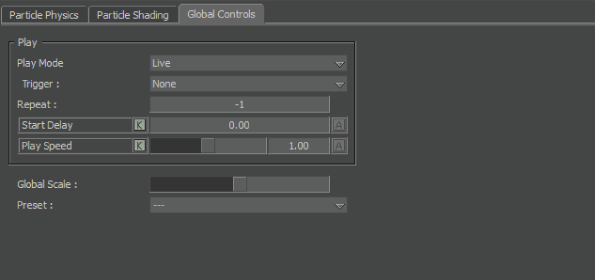 The Global Controls pane in the shader settings lets you control the activity of the particles used in the Particle shader, such as setting the playing speed, playing mode, and scaling.