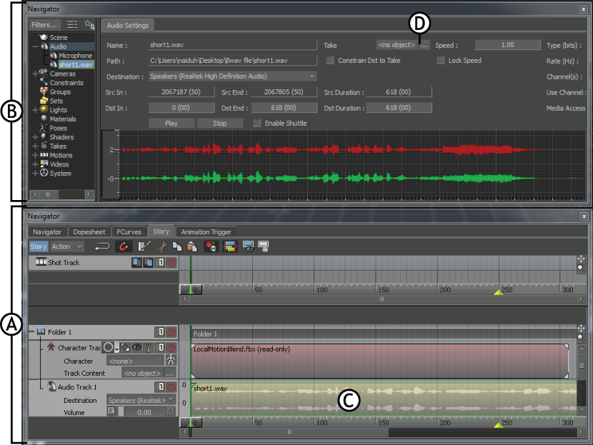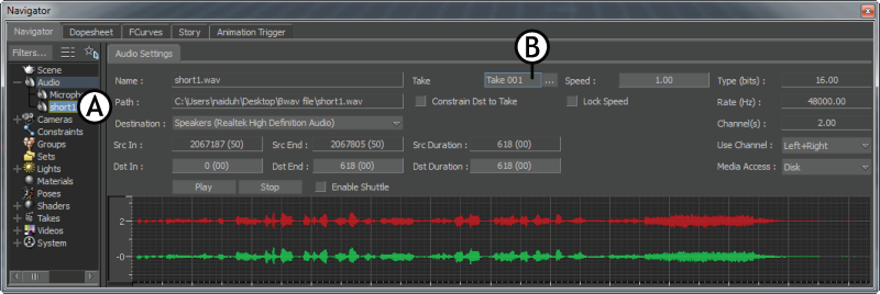 Navigator window A. Audio file B. Take to which the audio file is assigned to
