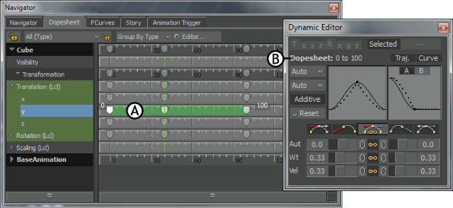 Editing keyframes A. Three keyframes selected in the Dopesheet window B. The Dynamic Editor indicating only the keyframes selected in the Dopesheet window are modified