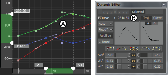 Editing keyframes A. Six keyframes selected in the FCurves window B. Dynamic Editor indicating only the keyframes selected in the FCurves window are modified