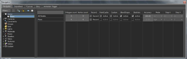Use the Polygon Count, Record, PointCache, Custom, BlendShape, Skeleton, Accuracy, Mode, Step U and Step V columns to alter models in your scene.