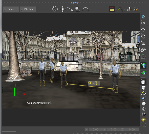 You can measure the distance between two objects in the scene using the Ruler tool. When a measured distance is displayed, it is always displayed at the current camera view, enabling you to see the measured distance when working in Orthographic view (Producer Front, Producer Back, Producer Top, Producer Right, Producer Left, Producer Top, or Producer Bottom).