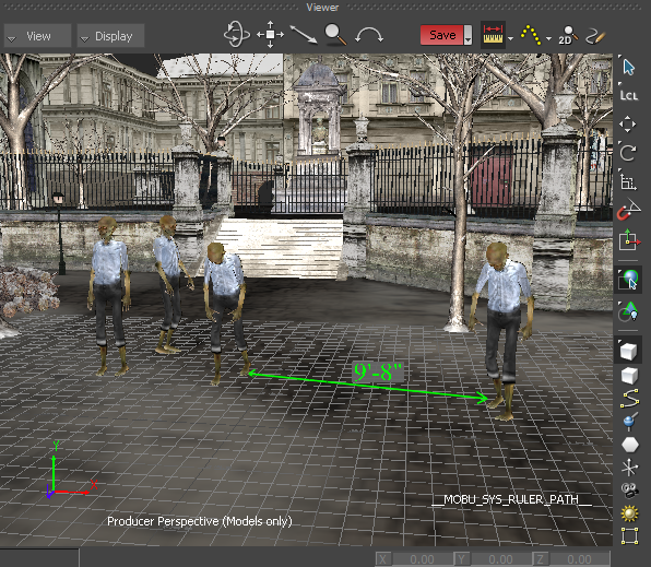 The system Ruler "object" is displayed in green when selected and the Viewer window indicates it is selected by displaying __MOBU_SYS_RULER_PATH__ at the bottom right, as shown in the following figure.