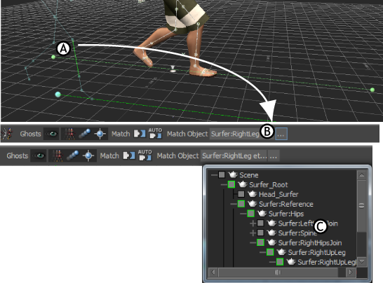 Alt-drag a selection into the Match Object field (A and B). You can also click the Match Object button, which lets you select a match object from the Asset list. The Asset list displays the entire contents of a scene, but you should only select a match object that is selected in the track.