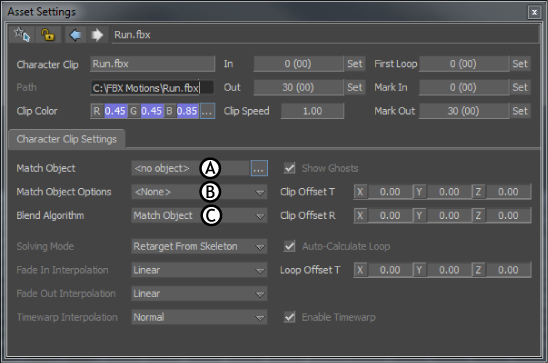 Character Clip settings in the Asset Settings window A. Match Object field B. Match Object Options menu C. Blend Algorithm menu