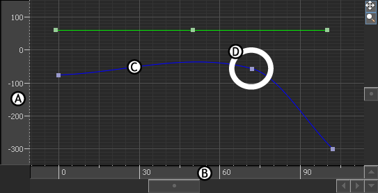 Axes in FCurves window A. Value on vertical axis B. Time on horizontal axis C. Function curve D. Keyframe