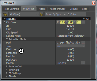 The Path field displays the path of the selected animation, character, camera animation, audio, or video clip. An empty Path field indicates that the selected clip has not been saved.
