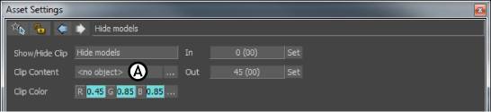 The Clip Content field lets you assign assets to Hide command and Show command clips. When you drag a Hide Models or Show Models asset from the Command folder in the Asset browser to the Story window, the new command clip that appears displays the name of the command followed by a <No models> message.