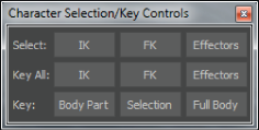 The Character Selection/Key Controls tool script allows IK, FK, Effectors selection and keying, and allows keying FullBody, Body part and selection without changing the keying mode.
