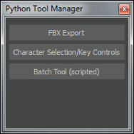 The Tool Manager displays the tool scripts available in the PythonStartup folder. In the following figure, the Tool Manager displays the CharacterSelection/Key Controls tool script (CharacterSelectAndKey.py) and the Batch Tool script (BatchTool.py).