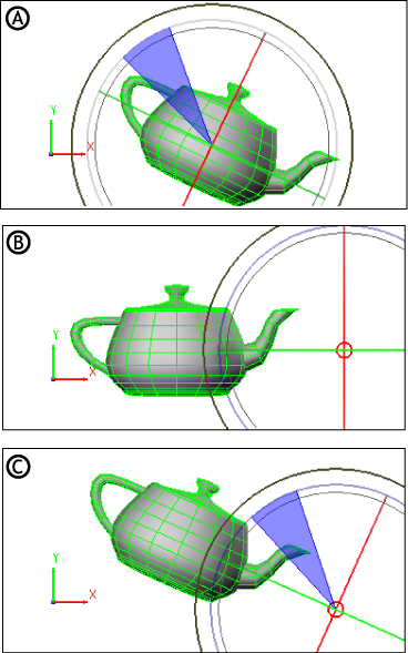 A. A tea pot rotates in place on the Z-axis. B. Tea pot Rotation pivot is offset C. Tea pot rotates around the offset pivot