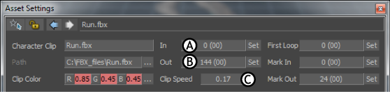 Asset Settings window A. In field B. Out field C. Clip Speed field