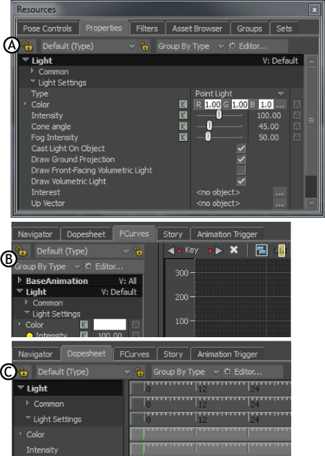 Property options A. Property options in the Properties window B. FCurves Property options C. Dopesheet Property option