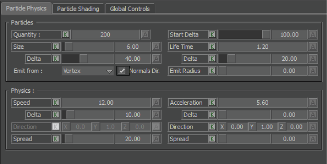 The Particle Physics pane in the Shader settings lets you customize the size, speed, direction and duration (known as “Life Time”) of the particles used in the Particle shader. It is divided into the Particles area and the Physics area.