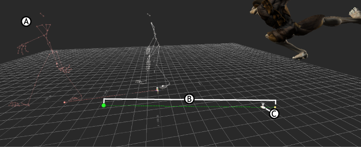 Viewer window showing ghosts A. Model ghost B. Clip ghost C. Travelling ghost