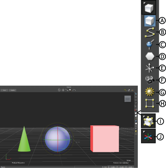 Object Selection icons A. Objects Selection mask B. Curve Selection Mask C. Skeleton Selection Mask D. Markers Selection Mask E. Nulls Selection Mask F. Camera Selection Mask G. Light Selection Mask H. Handle Selection Mask I. Vertex J. Pivot
