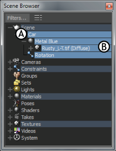 Branch selected in the Scene browser A. Old Car model B. Old Car’s associated assets