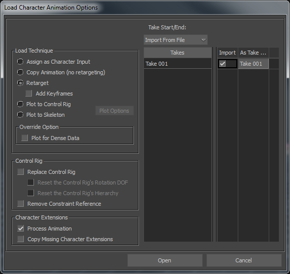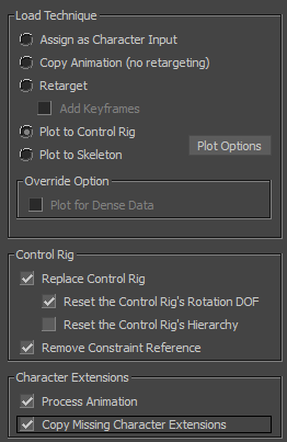 - Under the Load Technique group, select the Plot to Control Rig option.