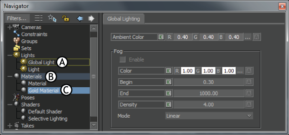 To select assets in a scene, click or double-click them in the Asset list of the Scene browser. When you select assets in the Asset list, three different colors indicate the selection and what displays in the Asset Settings area: The yellow outline indicates the asset’s settings are displayed in the Asset Settings area. The dark blue color identifies the asset’s branch. The light blue color identifies the selected asset.