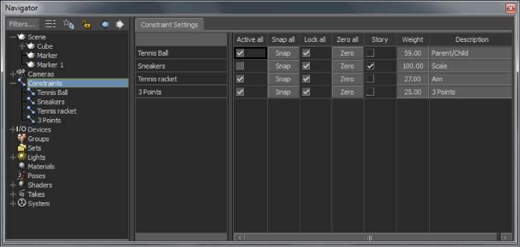 You can use the constraint root folder to Activate, Snap, Lock, Zero, View in Story, and set Weighting for multiple constrains at the same time.
