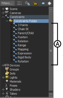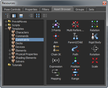 In the Asset browser, the Constraints folder lets view and access constraint assets you can add to your scene.