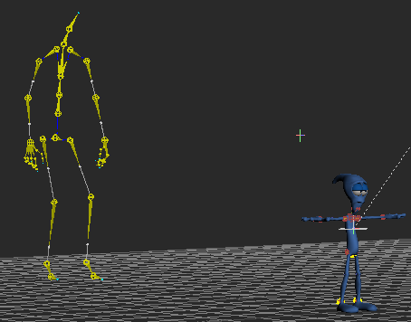 A large yellow skeleton representing the motion capture animation now joins Pepe in the scene.