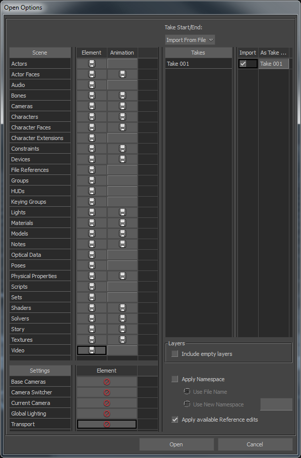 The Open Options dialog appears displaying disabled camera settings.