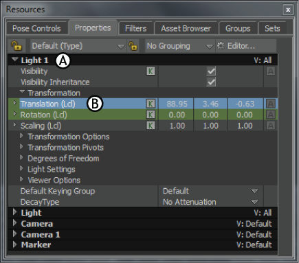 Properties window A. Light 1 is not part of a group B. Light 1 translation properties