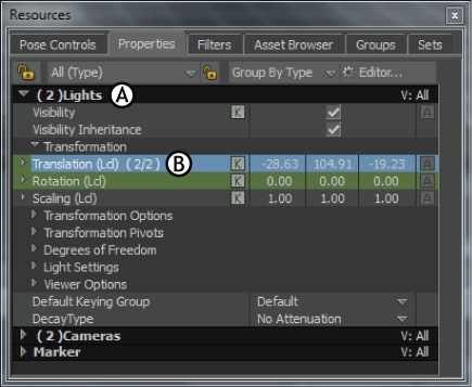 Elements of the same type are grouped together. For example, in the following figure, the lights are grouped (A). You can modify the properties of all models at the same time, but modify the properties of lights separately from models.
