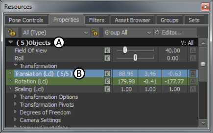Properties window A. Grouped objects B. Grouped objects’ translation properties