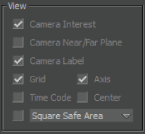 Camera view area A. Camera Interest option B. Camera Near/Far Plane option C. Camera Label option D. Grid option E. Axis option F. Time Code option G. Center option H. Safe Area option I. Safe area menu