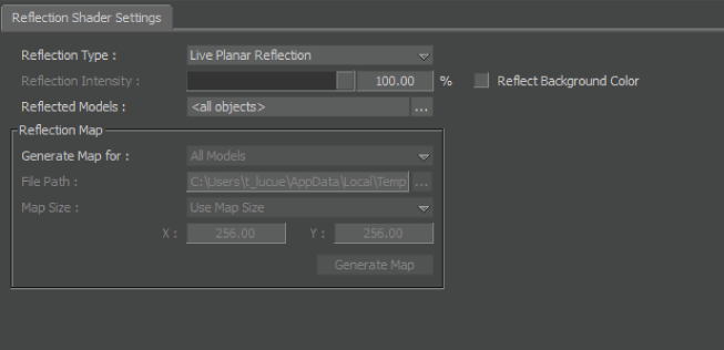 | Generate Map For | The Generate Map For menu lets you select which objects are included in the Reflection shader’s map texture. Choose either All Models or select particular models you want to appear and choose Selected Shaded Models. |