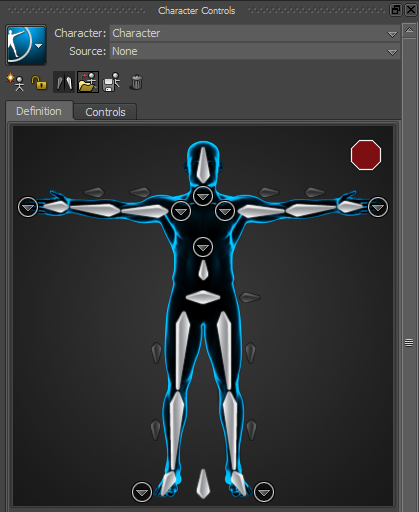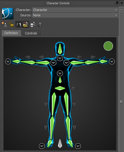 In the Character Controls window, the Character representation in the Definition pane displays a green symbol (