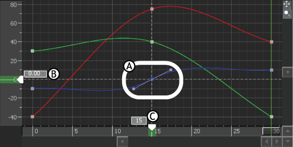 A. Selected keyframe with tangent handles B. Value (0.00) of selected keyframe displayed in the Value display C. Time (frame 15) of selected keyframe displayed in the Time display