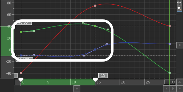 When multiple keyframes are selected, a dotted line outlines the selection area (as seen in the following figure), and four values display, two on the Vertical axis, and two on the Horizontal axis.