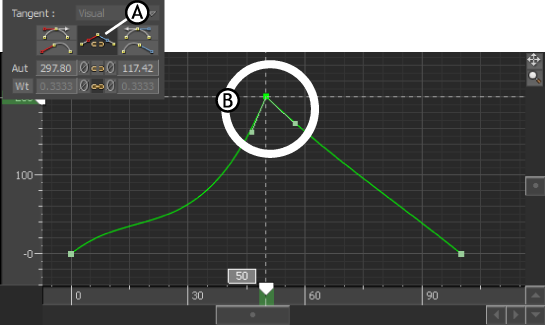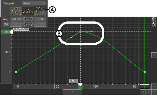 Break/Unbreak tangents optionA. Option is in active mode B. Tangent handles of a selected keyframe are broken. Each handle moves independently.