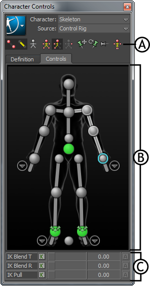 Controls tab A. Toolbar B. Character representation C. Blend and Pull controls