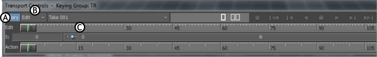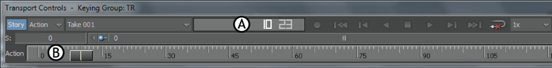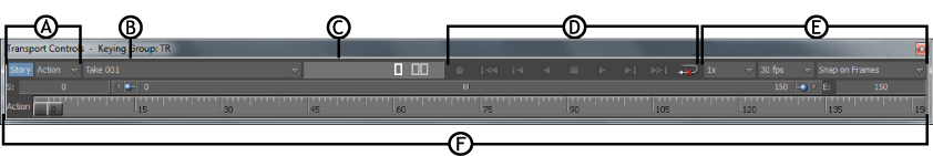 Transport Controls window A. Story Mode option and menu B. Current Take menu C. Timecode field D. Play Controls E. Timing Controls F. Action timeline