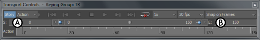The Zoom Start and End time codes (A, B) define the beginning and end of the zoomed segment of the current take on the Action timeline. These fields are distinct from the Start and End fields that define the entire length of the current take on the Action timeline.